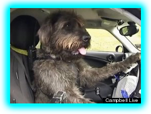 D-day is on Monday when Campbell Live will broadcast the first ever live pictures of a dog driving a car when Porter takes journalist Tristram Clayton for a hoon around a track. You’ll all be queuing for a rescue dog on Tuesday morning – great companions and useful as designated drivers now too.