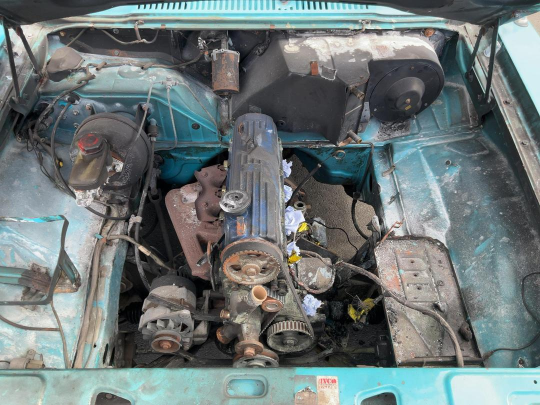 Under the bonnet is where things get shaky, but I’ve seen much worse. The 2L pinto engine still has a rubber timing belt fitted that is not melted. Other plastic parts, such as the brake fluid reservoir, are also not melted. Maybe this car has a future? It’s a project, of course, but it is still registered.
